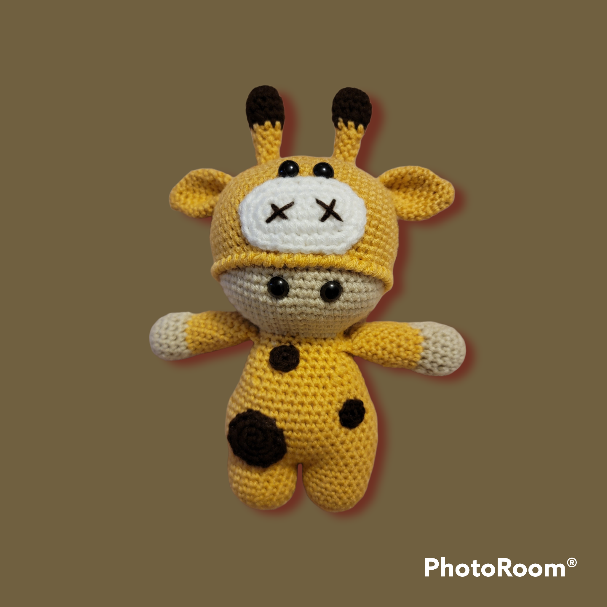How cute is this crocheted baby doll wearing a giraffe suit?! Made with acrylic yarn, stuffed with polyfill fibers and using safety eyes. Order yours today and start having loads of wild fun with a new playmate!!